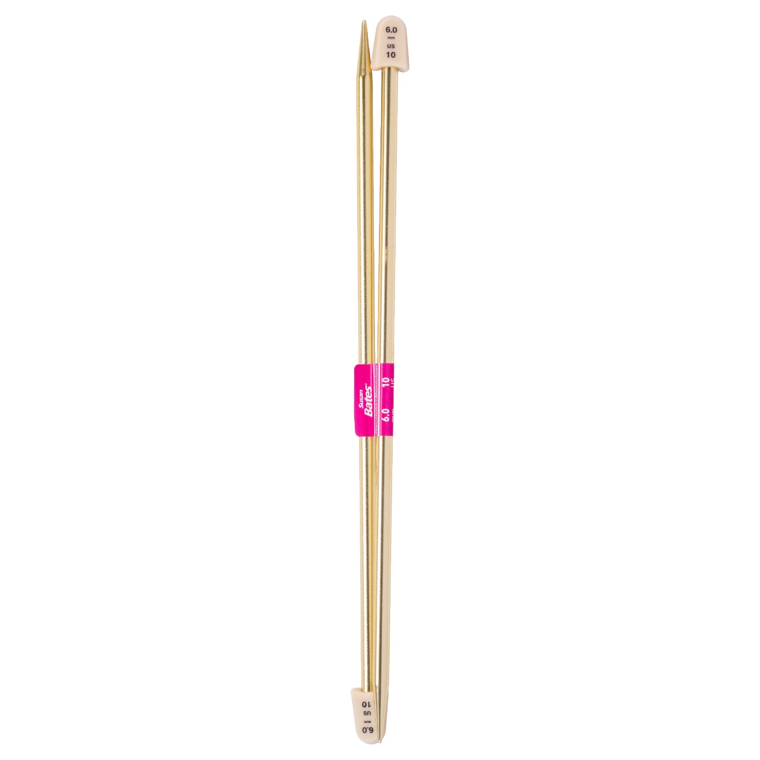 Susan Bates Silvalume lightweight aluminum knitting needles feature a non-rolling knob design along with color coded sizes for quick identification. Straight needles are perfect for creating flat knitted projects or pattern pieces. This package contains one pair of 10 inch single point knitting needles. Size: 10/6mm. Available in a variety of sizes. Each sold separately. Imported.