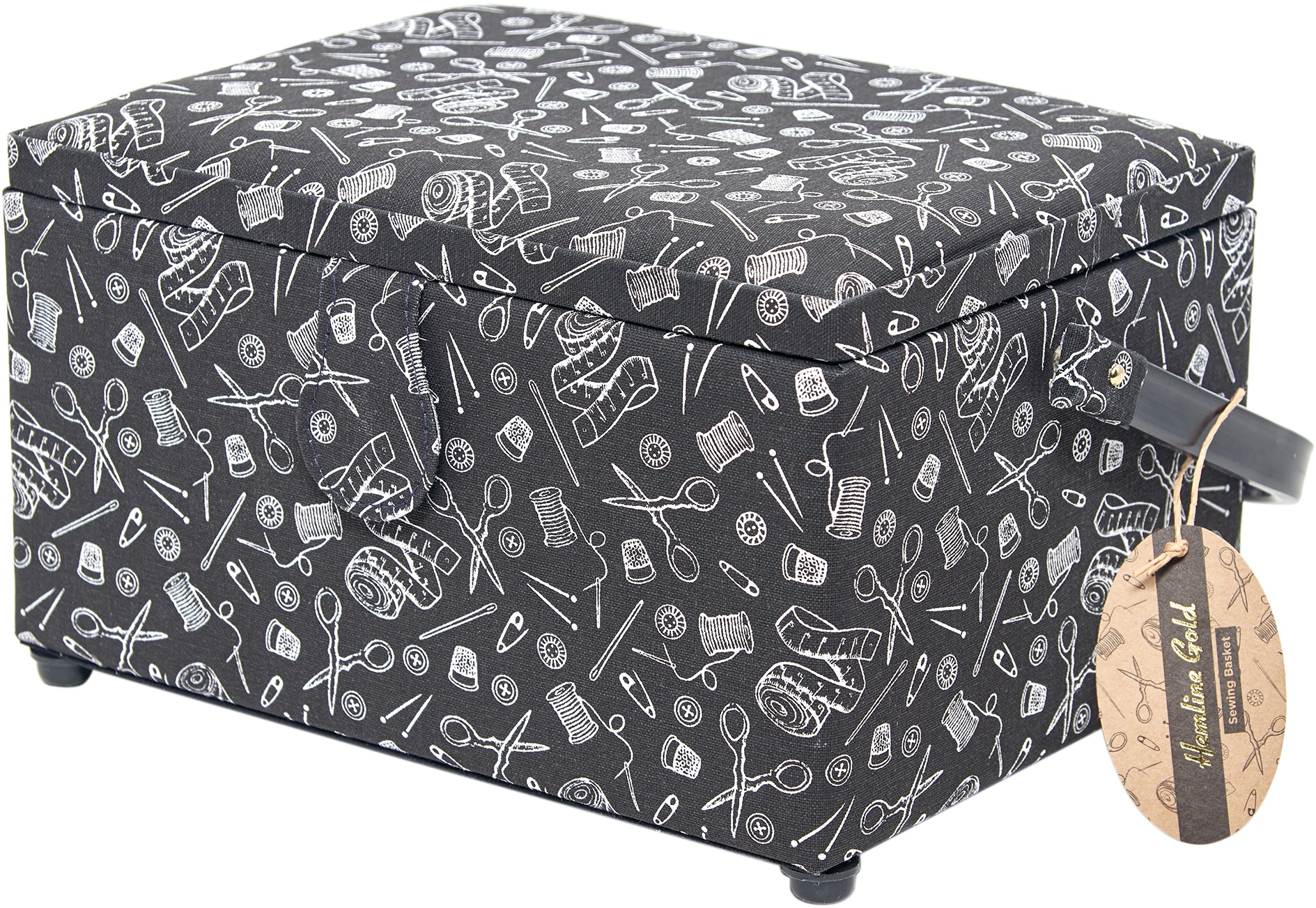 Black cotton fabric lining with plastic feet. Measures 10.2"x7.5"x5.7". Strong construction with padded exterior, sturdy plastic handle and strong magnetic closure. Built-in pincushion and storage pocket. Handy clear plastic tray to help keeps items organized. Plastic free packaging.