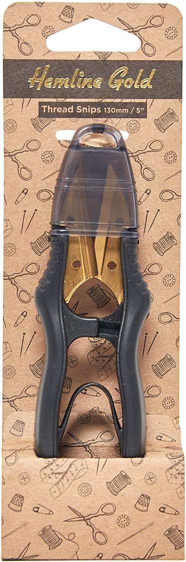 Thread snips. Extra sharp steel gold blades with pointed tip for precise trimming. Tip of blade comes with protective plastic cap. Arch spring enhances cutting power. Pocketed-friendly with safety cap. Perfect for small, quick and accurate cuts. Spring loaded handle with finger hole handle. Plastic free packaging. Colors: Black and gold.