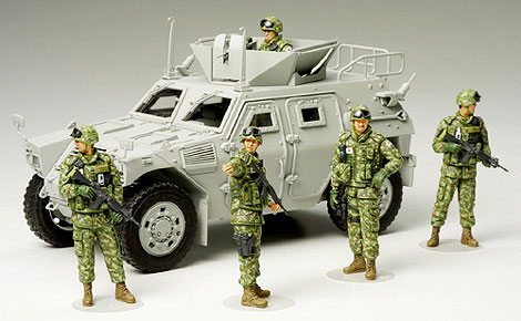 Infantry Model Figures by Tamiya. JGSDF Iraq Humanitarian Assistance Team Coinciding with the release of the JGSDF light armored vehicle used in Iraq in the 1/35 scale MM Series, Tamiya introduces a set of 1/35 scale JGSDF figures. Set includes 5 figures, 1 team leader holding binoculars, 1 sub-leader pointing, 2 soldiers on patrol holding 5.56mm automatic rifles, and 1 soldier designed to be placed in the JGSDF Light Armored Vehicle. This figure set is perfect for adding that finishing touch to your light armored vehicle or for creating a realistic diorama. Accurate reproduction of all standard equipment including automatic rifle and cartridge, microphone and receiver headsets and uranium emission detection device. Set also includes a 110mm Panzerfaust 3 anti-tank rocket launcher. Includes decals for replication of Japanese flag displayed on the uniform. « less