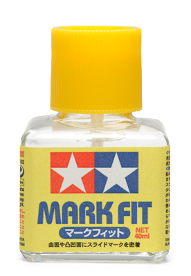 The 40ml bottle contains a convenient brush for easy application. How to Use Apply Mark Fit solvent to area where decal is to be positioned. Place decal onto the area. Slide decal into correct position by a wet finger. Use a soft cloth or cotton swab to remove excess water and any air bubbles. Apply Mark Fit over the decal again, and then use a soft cloth or cotton swab to conform it to the model's surface. Do not touch until decal dries completely. « less