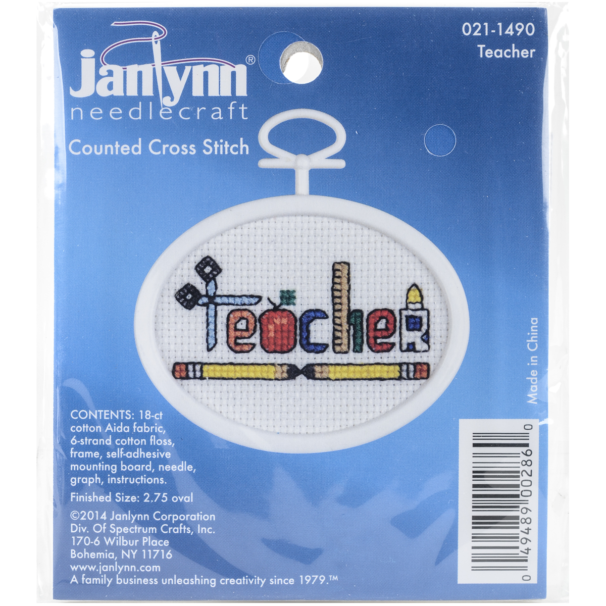 Janlynn-Mini Counted Cross Stitch Kit. Creative designs and quality products are put in to each of Janlynn's kits! This package contains 18-count cotton Aida fabric, 6-strand 100% cotton floss, one stitching frame, one self-adhesive mounting board, one needle, one graph and instructions. Design: Teacher. Finished dimensions: 2-3/4x2-3/4 inches. Imported.