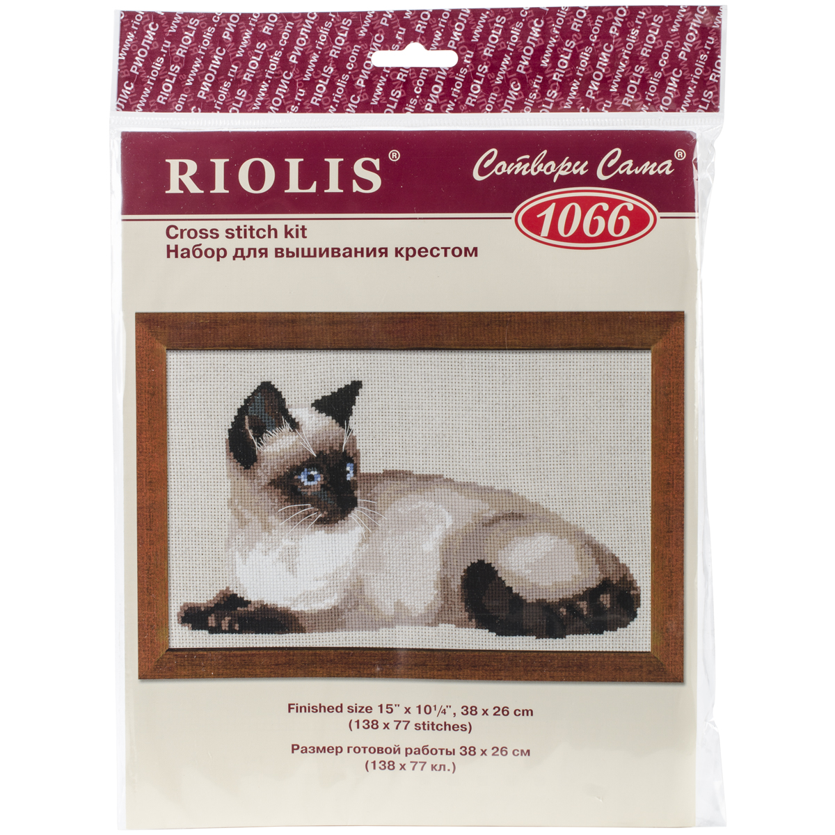 RIOLIS-Counted Cross Stitch Kit. Express your love for arts and crafts with these beautiful cross stitch kits! Find a themed kit for any taste! This package contains 10 count flaxen evenweave fabric, woolen and acrylic yarn in twelve colors, one needle and one color chart. Design: Thai Cat. Finished Size: 10-1/4x15 inches. Imported.