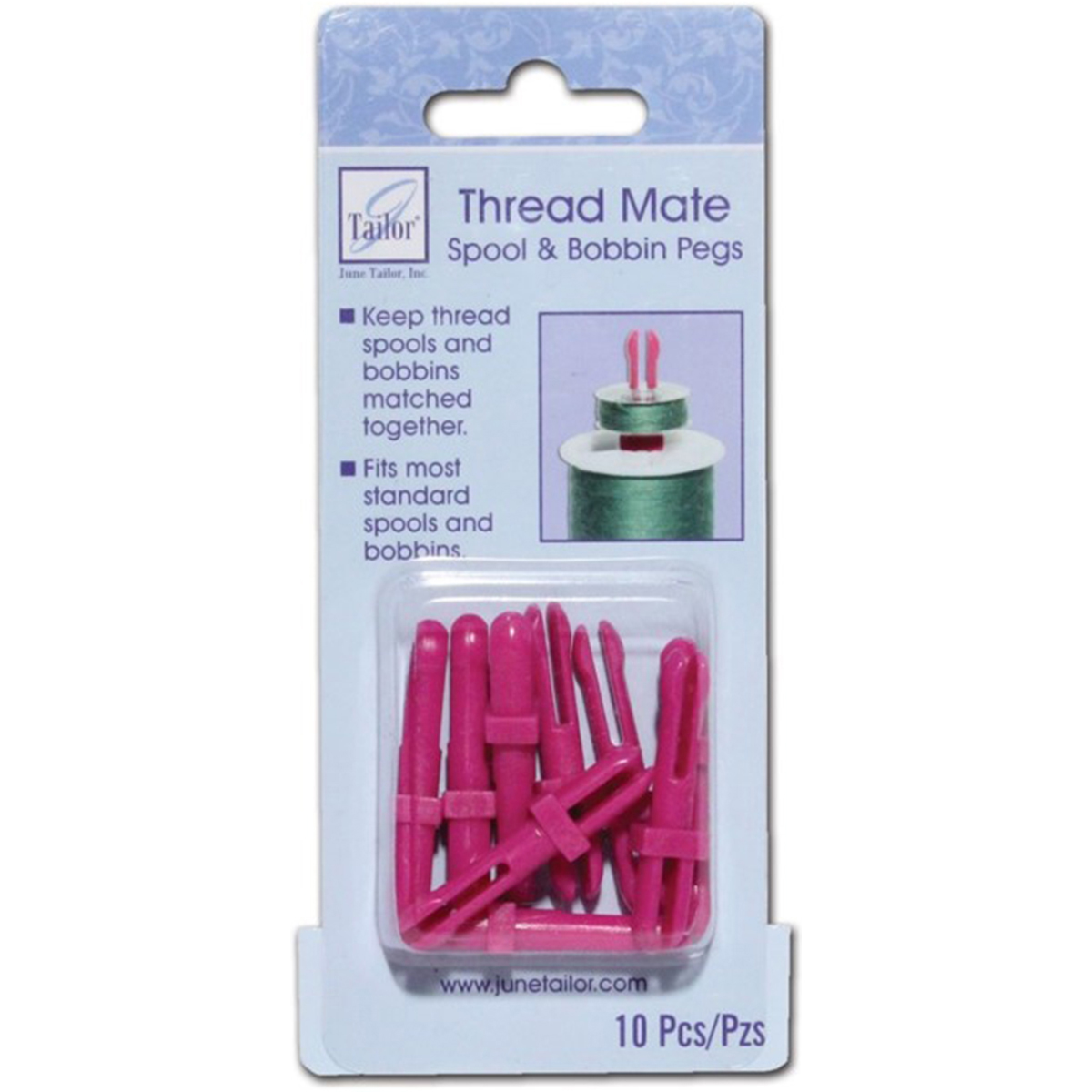 June Tailor-Thread Mates Spool & Bobbin Storage. Keep thread spools and bobbins matched together! Fits most standard spools and bobbins. This package contains ten spool and bobbin pegs. Imported.