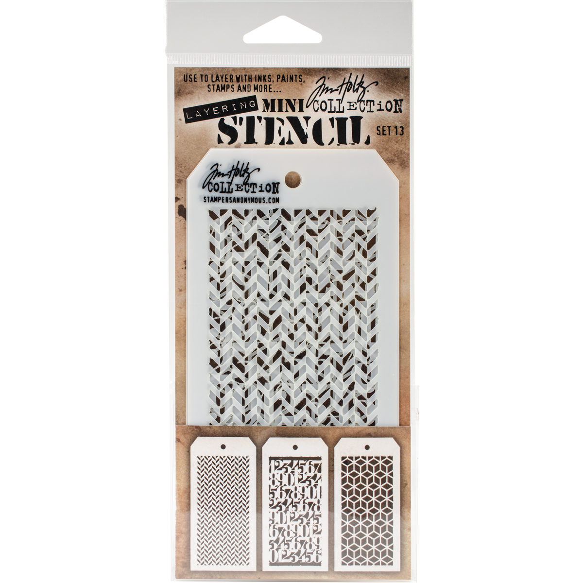Art All Gone-Tim Holtz Mini Layered Stencil Set. Use these stencils to layer with inks, paints, stamps and more to create unique designs and paper crafts! This package contains three 6-1/4x3 inch stencils. Comes in a variety of designs. Each sold separately. Made in USA.