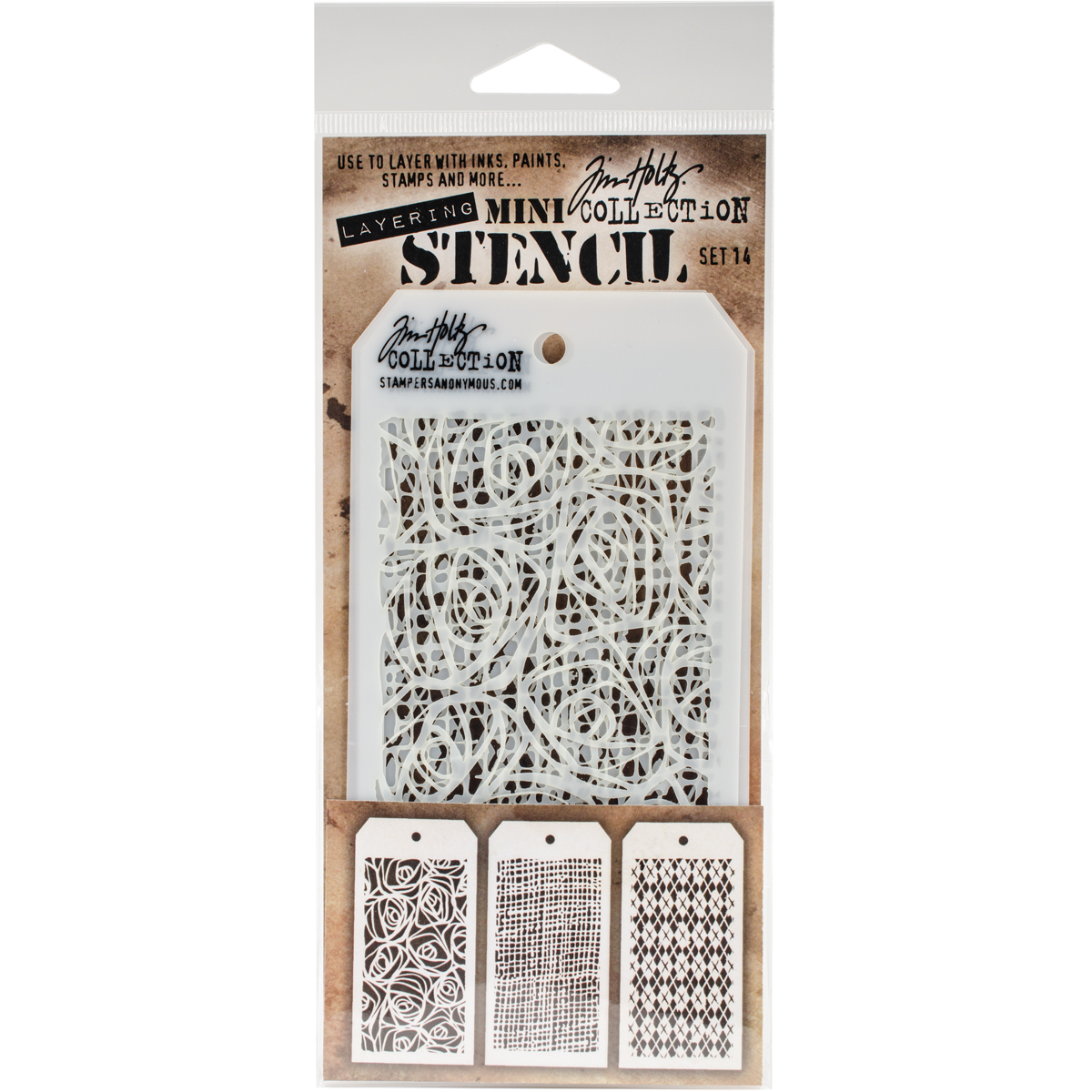 Art All Gone-Tim Holtz Mini Layered Stencil Set. Use these stencils to layer with inks, paints, stamps and more to create unique designs and paper crafts! This package contains three 6-1/4x3 inch stencils. Comes in a variety of designs. Each sold separately. Made in USA.