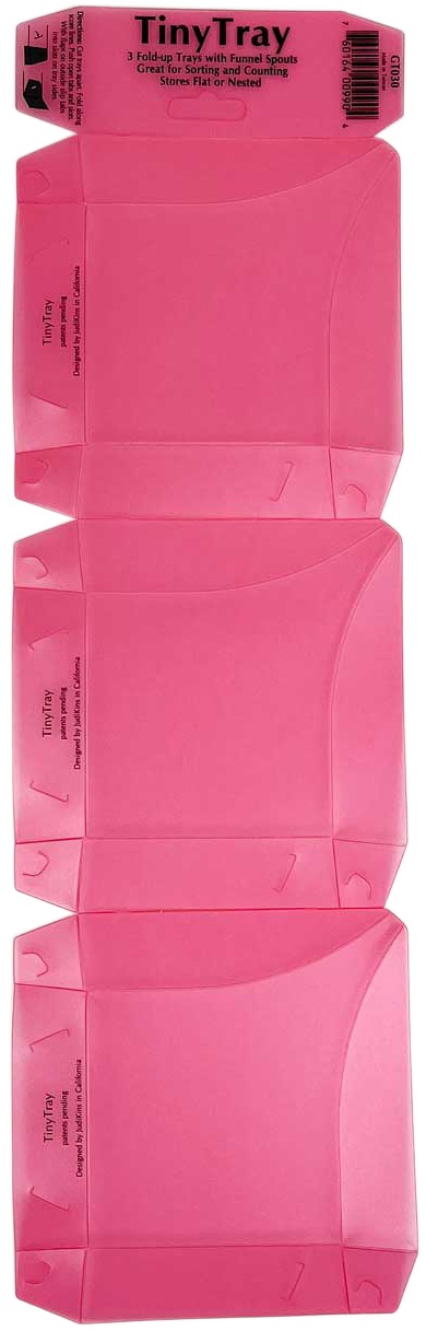 Judikins-Tiny Trays. A mini version of the popular Snappy Tray. Tiny Trays come in sets of three because one is just not enough! Just fold them together for instant storage! The Tiny Trays nest when folded and are great for sorting beads, holding messy craft items and keeping your desk organized. The patented built-in funnel makes it easy to return small items to their original containers. This package contains three 3-1/4x3-1/4x1 inch Tiny Trays. Color: Clear. Assembly required. Imported.