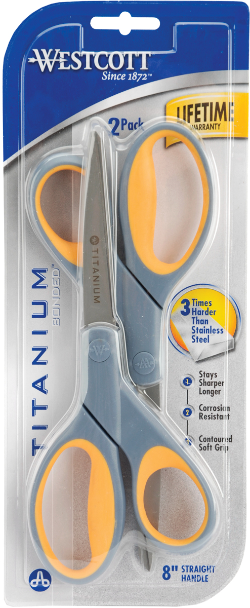 ACME-Westcott Titanium Straight Scissors: 2/pkg. Titanium is a high performance metal that is lightweight like aluminum, stronger than steel and highly resistant to rust and corrosion. Acme uses a process that bonds titanium to a stainless steel core to produce a sharper, more durable and longer lasting cutting edge for home and office use. These scissors will stay sharp and smooth-cutting for years making them an exceptional value. This package contains two 8in scissors with contoured soft grip finger holes. Imported.