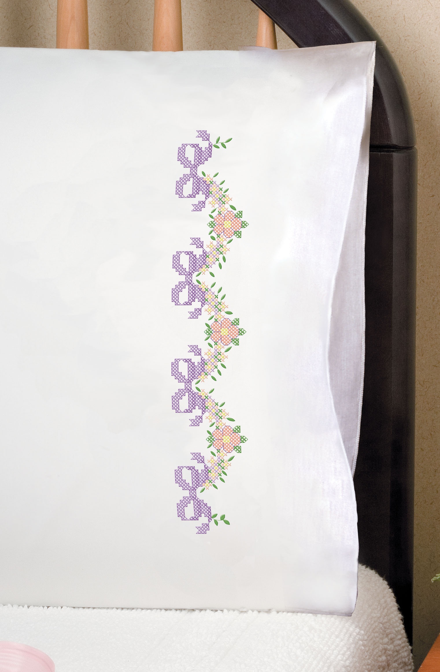 A great way to put your own creativity in a room! Design is printed with easy to follow blue ink that will easily wash out. This package contains two preprinted standard poly/cotton pillowcases, easy to follow instructions and a suggested floss shopping list. Floss not included. Package includes a suggested floss shopping list or you can use colors to match your personal home decor. Finished size: 20x30 inches. Makes two. Design: Floral Ribbons. Made in USA.