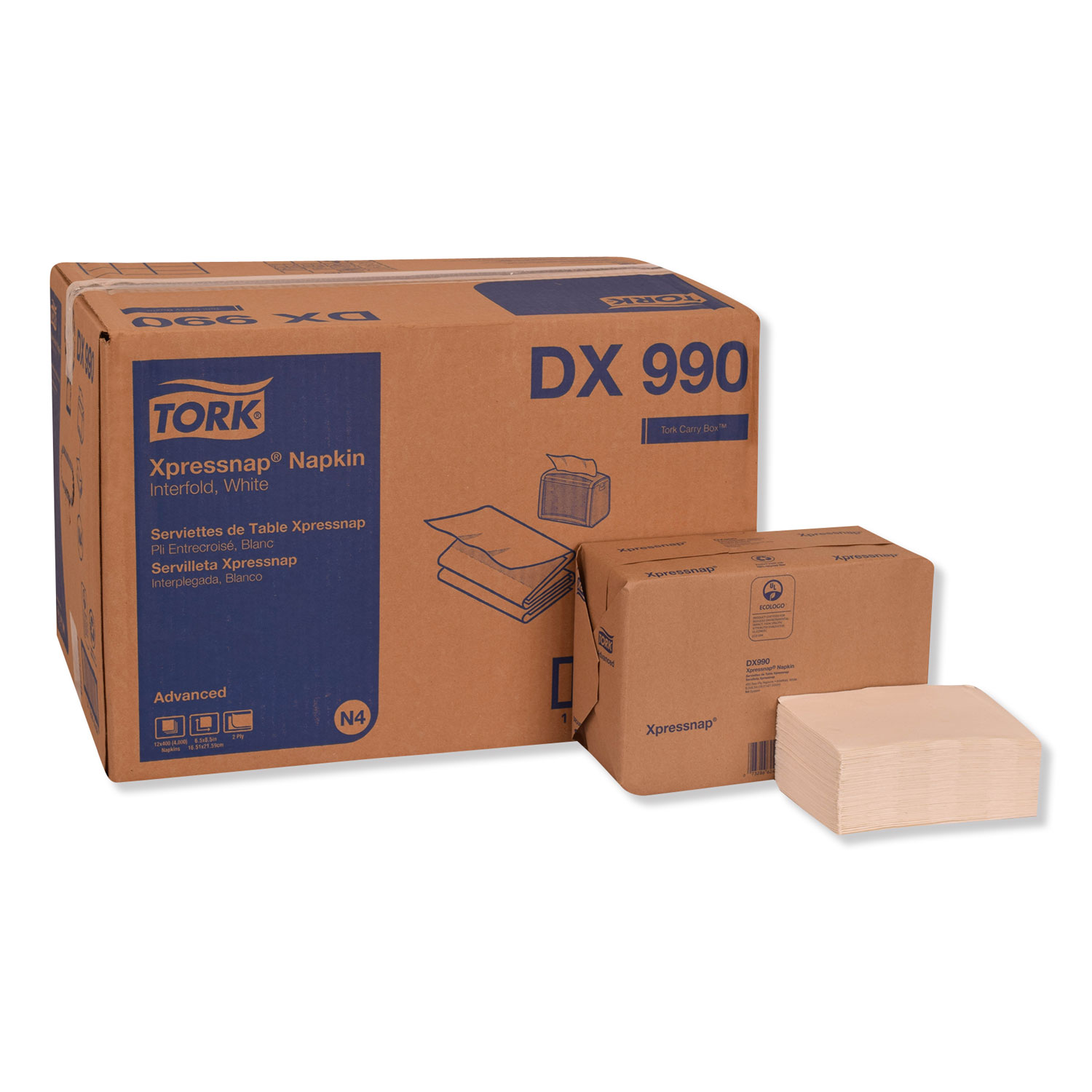The Tork® Xpressnap® napkin dispensing system (napkin and dispenser) delivers one-at-a-time, improving hygiene and reducing consumption by at least 25%, when compared to traditional dispenser napkins. Quarterfold design is larger than many competitor interfolded napkins which are only half fold. Made from recycled fiber, offering a positive image builder. Featuring the Tork® Easy Handling® carry box. Advanced. Material(s): Paper; Color(s): White; Width: 6.5"; Depth: 8.5".
