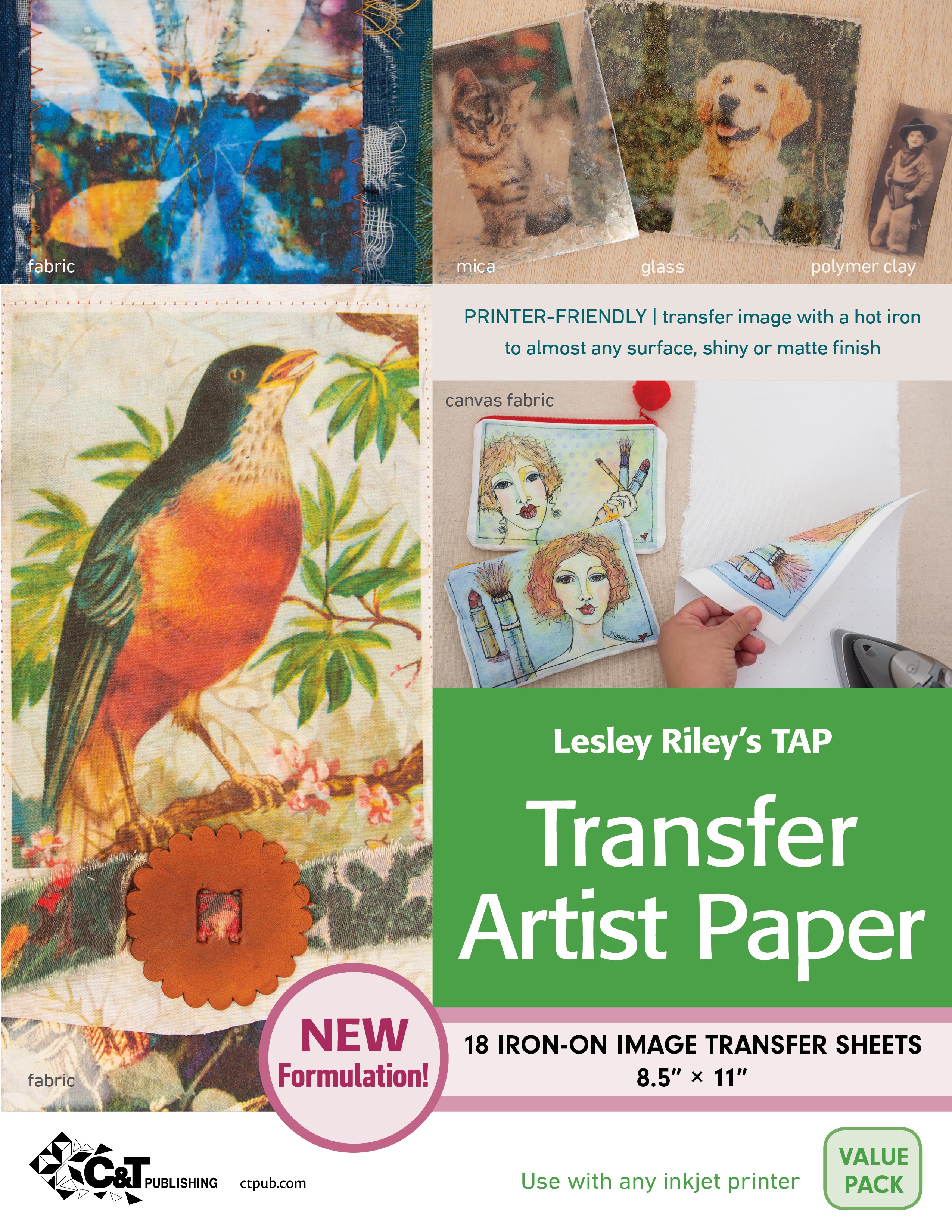 C&T PUBLISHING-Leslie Riley's TAP Transfer Artist Paper. Transfer images with a hot iron to virtually any surface-fabric, paper, wood, glass, canvas, metal, and more! Just inkjet print, paint, stamp, or draw images on TAP, iron it onto just about any surface and your transferred images are crisp and colorfast. Made to be washable and crack resistant on fabric. Overlap your images to create unique layered looks or use your imagination-the sky's the limit. This package contains eighteen 8-1/2x11in sheets of TAP and instruction. Works with any inkjet printer. Made in USA.