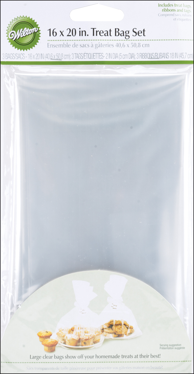 WILTON-Treat Bag Set. Large clear bags are ideal for cookie platters, pies, scones and more. Large bags show off your homemade treats at their best! This package includes three 16x20 inch bags as well as ribbons and tags. Treats not included. Imported.