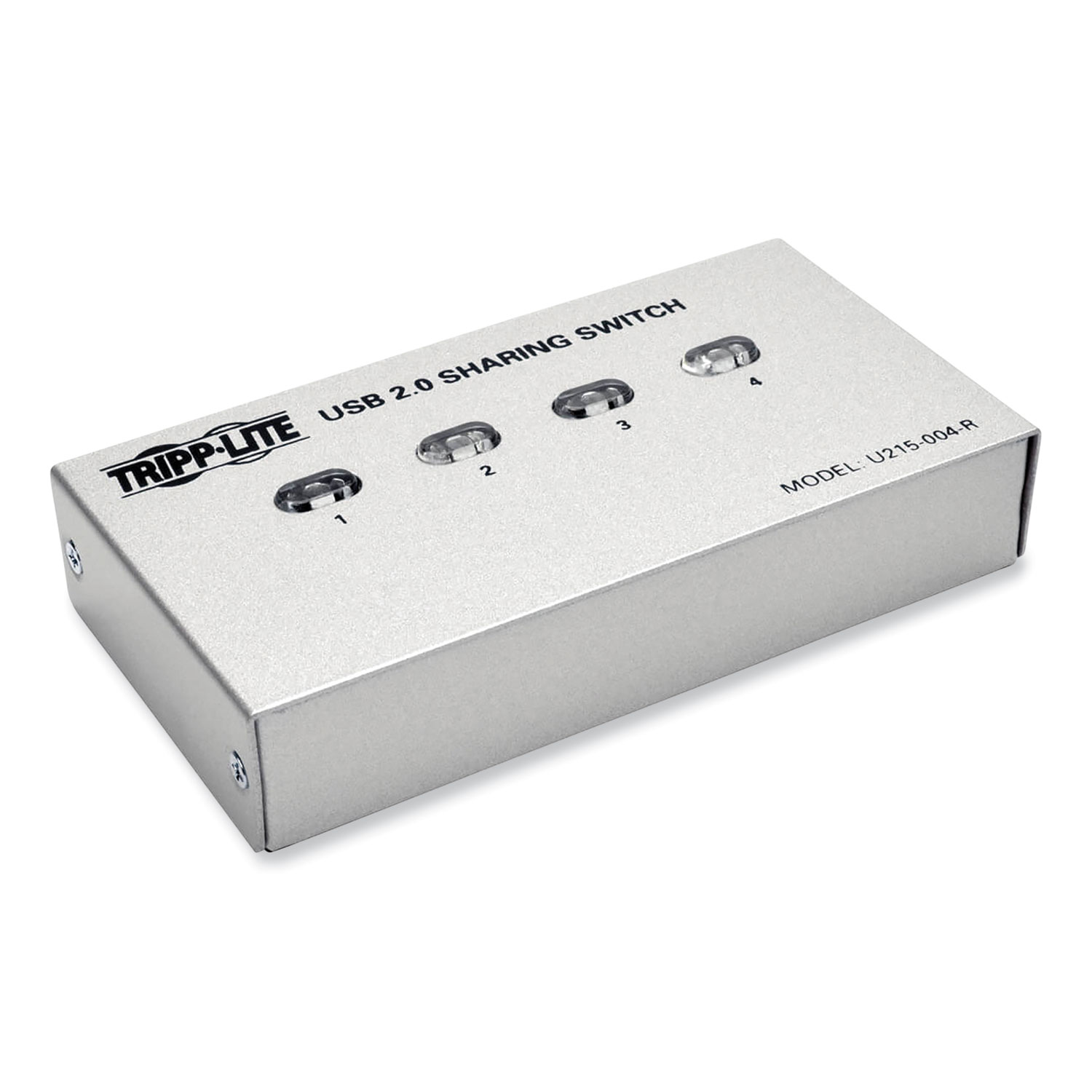 Tripp Lite's U215-004-R 4-port USB 2.0 Peripheral Sharing Switch allows you to connect up to four computers to one USB peripheral such as a printer, scanner, high-capacity hard drive and many others. Ideal for and small office computers. It not only saves space, but also eliminates the cost of buying separate USB devices for every computer. Plus, it simplifies cable management in the office area. Quickly switch between computers using keyboard hot-keys, mouse, or manually. Plug-and-play functionality makes installation a breeze. Supports both high-speed USB 2.0 peripherals with transfer rates up to 480 Mbps. Backward compatible to legacy USB 1.1 devices. Compatible with most major operating systems. Icon task bar indicates switch status at a glance, and active LEDs indicate which computer is currently using the peripheral. No separate AC adapter required. Power is drawn through the USB cables. Connector/Port/Interface: USB; Number of Ports: 4; Connects Devices (From/To): 1 Printer/Scanner/External Hard Drive to Multiple Computers; Color(s): Silver.