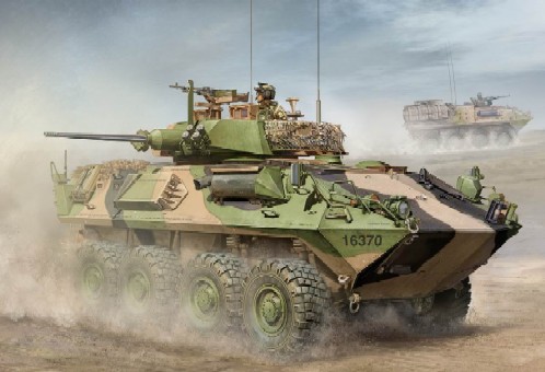Rear mounted propellers give the vehicle a speed of 10 km/hr. in water. The turbocharged GM 6V53T diesel engine gives a top road speed in excess of 100 km/h. A range of 600 kilometres is possible. The turret mounts the M242 25mm cannon, which has a selectable rate of fire varying from single shot to 100 and 200 rounds per minute. This plastic model kit is an accurate representation of the military vehicle. « less