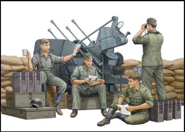 Artillery Crew Model Figures by Trumpeter. (4) finely sculpted, injection-molded plastic German soldiers at rest, separately molded, no weapons or equipment. Sand bags, gun and ammo boxes not included. Includes painting reference.
