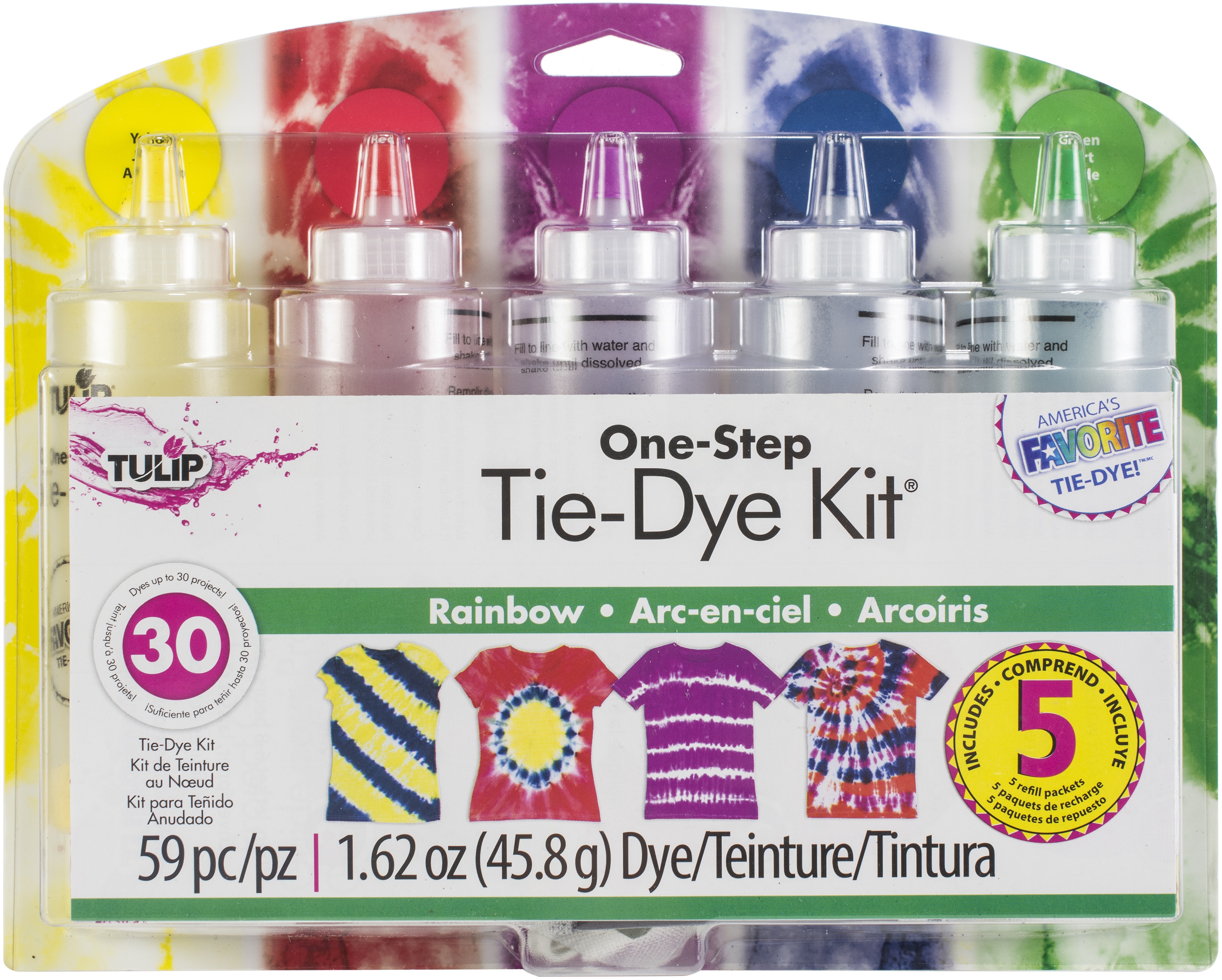 I Love To Create-Tulip One Step Tie Dye Kit. The Tulip One-Step 5- Color Tie-Dye Kit is full of tons of colorful fun! Stocked with five bottles of vibrant One-Step Dye, five dye refill packets, supplies and an inspiration guide, this kit is ready for your creativity. Who knew tie dyeing could be this easy? Perfect for solo projects and family fun. Create up to thirty projects. No need to presoak fabrics in soda ash before dyeing. Use with 100% natural fiber fabrics like cotton, rayon and wool for best results. Dyes are safe to machine wash, colors stay bright and bold through repeated washings. This 7-3/4x9-3/4x2 inch package contains five squeeze bottles containing dye, five due packets, eight protective gloves, forty rubber bands and one step-by-step technique guide featuring over eight tie-dye looks to choose from. Comes in a variety of colors. Each sold separately. Conforms to ASTM D4236. Imported.