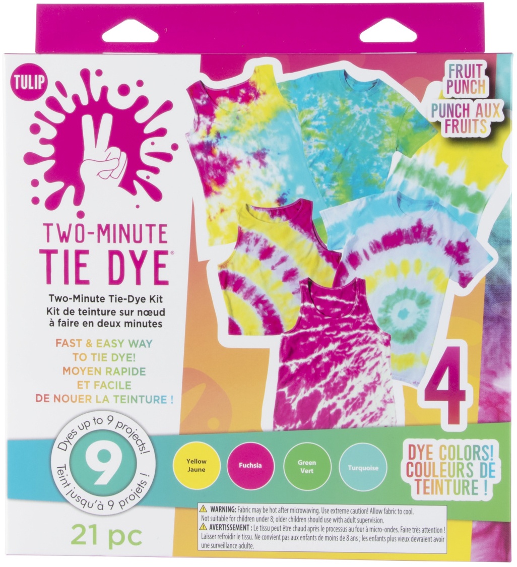 Speed up the dye set process from 8 hours to 2 minutes with the same vibrant results! This patent-pending Two-Minute Tie-Dye Kit features specially made containers and supplies to make tie-dye magic in just minutes. For use with 100% cotton fabrics only. This 8.75x3x9.5 inch package contains Two specially made containers, four squeeze bottles containing dye (colors: yellow, fuchsia, turquoise and green), ten rubber bands, two pairs of protective gloves and a project guide. WARNING: Fabric may be hot after microwaving. Use extreme caution! Allow fabric to cool. Not suitable for children under 8; older children should be under adult supervision. Conforms to ASTM D4236. Imported.