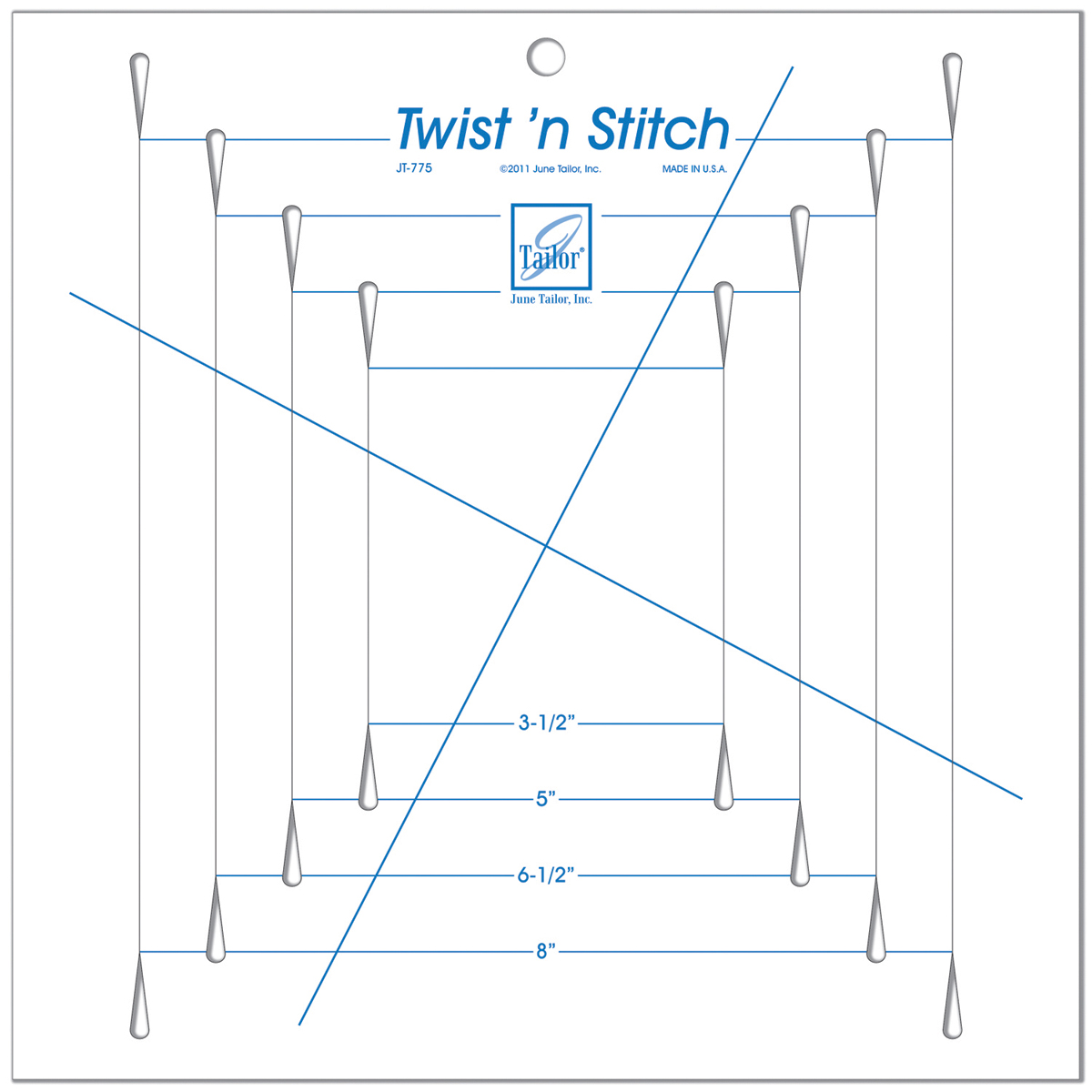 JUNE TAILOR-Twist 'n Stitch Ruler. This clear plastic ruler and template creates perfect pinwheel blocks, borders, and quilts from patched squares. It cuts five different sized pinwheel blocks from 3 to 10 inches (finished) and canbe used with fat quarters and fabric scraps. Included with the instructions are layout options and fabric requirements. Each package contains one Twist 'n' Stitch Ruler. Made in USA.