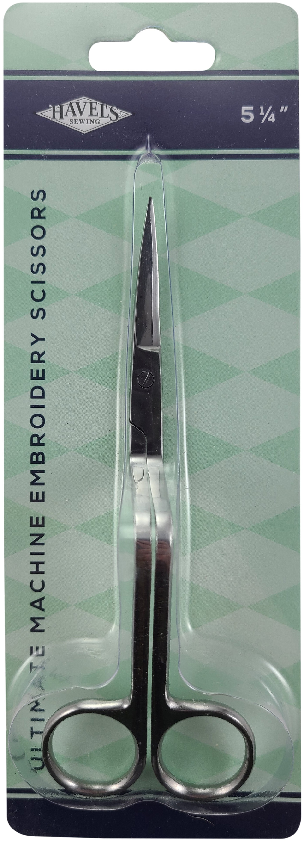 HAVEL'S-Ulti-Mates Scissors. These specially shaped scissors are perfect for machine embroidery, quilting, sewing, and other needlecrafts! The unique raised loop design fits over embroidery hoops and keeps fingers out of the way. The curved blades make closer cuts too! This package contains one pair of stainless steel Ulti-Mates Scissors (5-1/2 long). Imported.