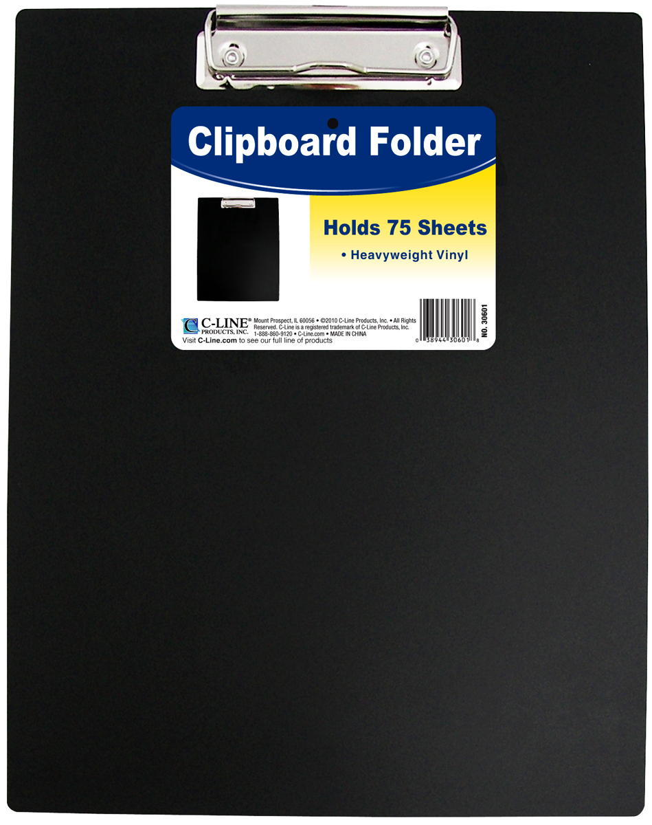 C-LINE-Clipboard Folder. Securely hold up to seventy-five sheets of paper in this combination clipboard and folder. The left half of the folder has a clear plastic pocket that is 5-3/8 inch deep. The right half of the folder has a silver spring-loaded clip that has a finger/thumb notch for ease in opening. In the center is a loop for holding a pen or pencil. This package contains one 12-3/4x9 inch black vinyl clipboard folder. Imported.