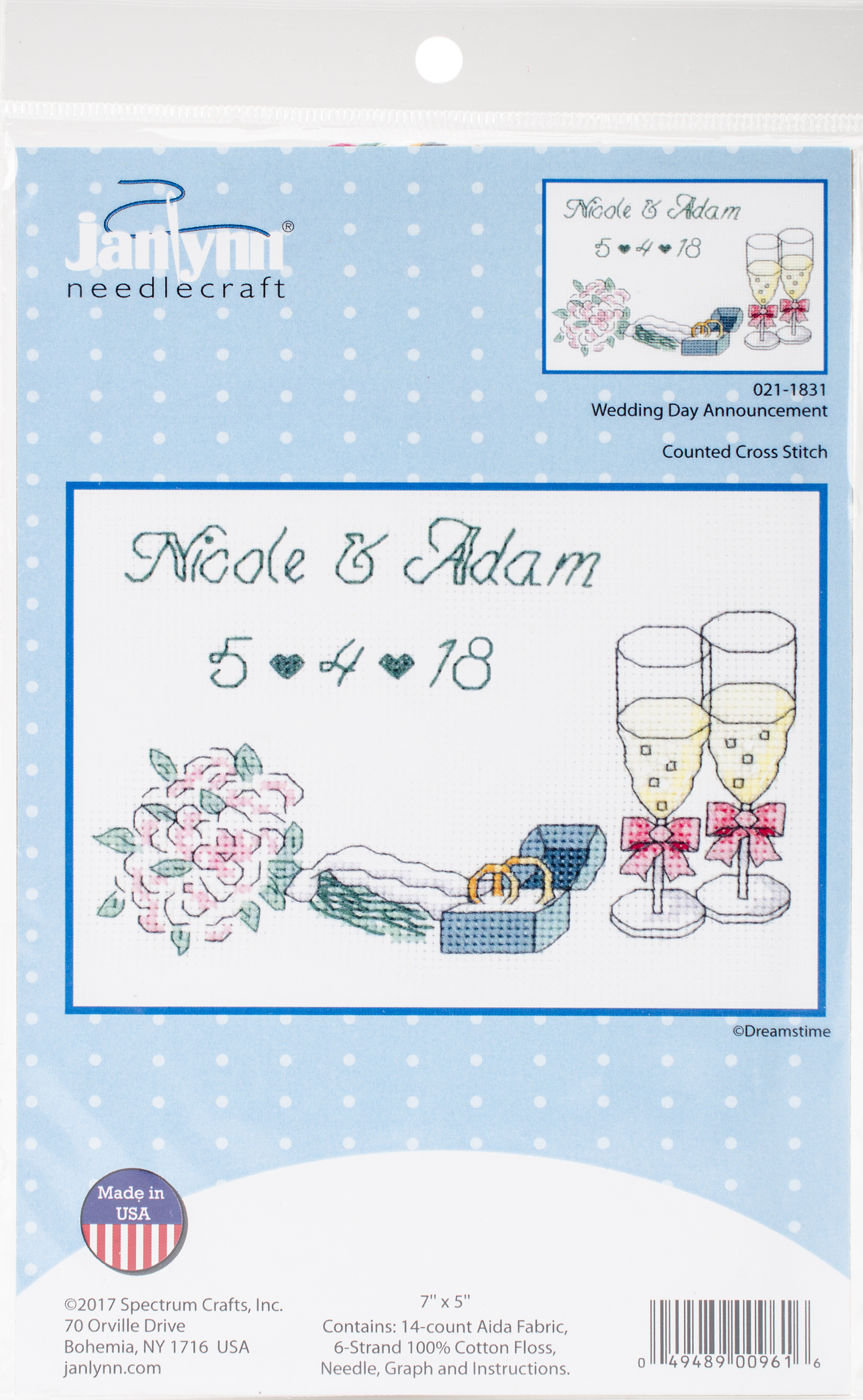 Creative designs and quality products are put in to each of Janlynn's kits. This package contains 14-count Aida, 6 strand 100% cotton floss, one needle, one chart and instructions. Design: Wedding Day. Finished dimensions: 7x5 inches (mat and frame are not included). Designer: Dreamstime. Made in USA.