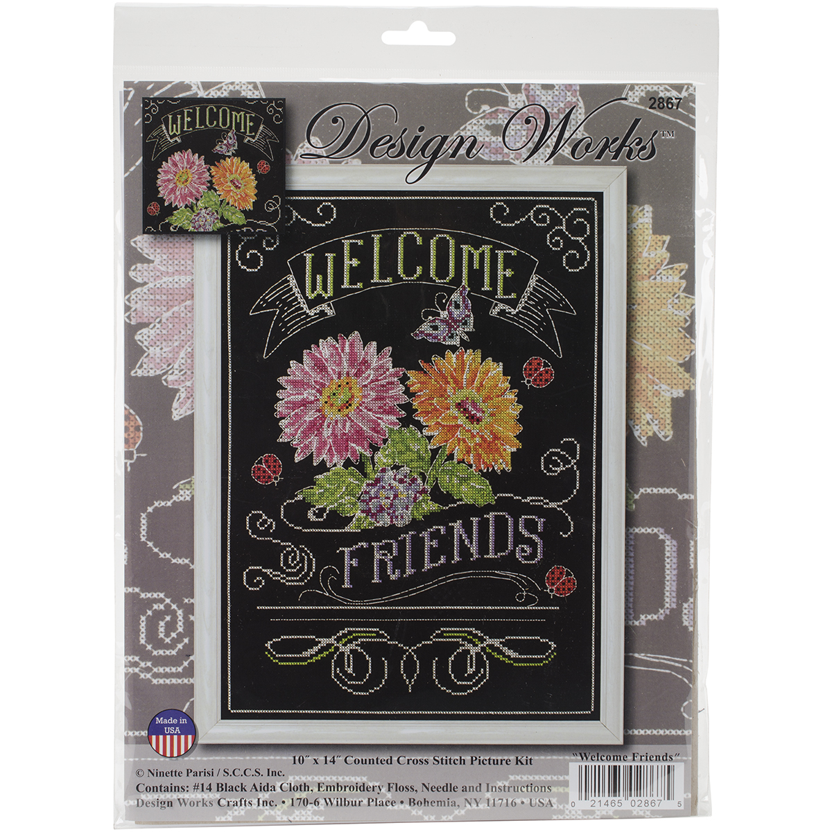 Tobin-Design Works Counted Cross Stitch Kit. Beautiful designs and top quality materials make Tobin one of the top cross stitch kit makers worldwide. This package contains 14-count black Aida cloth, embroidery floss, one needle and instructions. Design: Welcome Chalkboard. Finished size: 14x10 inches. Made in USA.