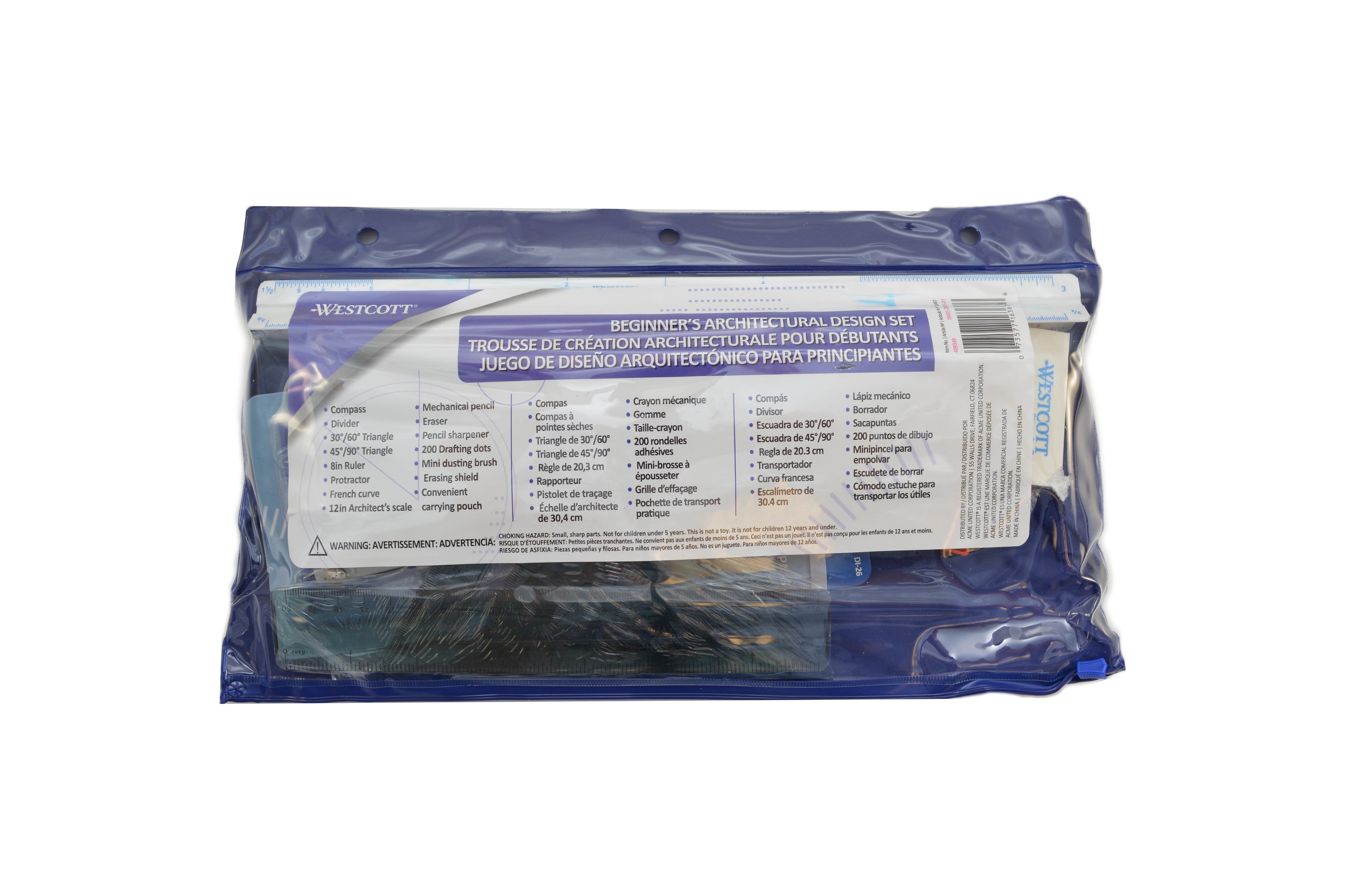 Westcott Drafting & Drawing Tools are some of the finest products of their kind for students and professionals. Our commitment to meticulous quality and cutting edge innovation in measurement and art materials has earned an unparalleled reputation. Ideal for students and early artists. It contains 1 of the following: Mechanical Pencil, 13017 Safety Compass, DI-26 Divider, FC-334 French Curve, ES-1 Erasing Shield, Manual Pencil Sharpener (15995), Single Eraser (146ten), Mini Drafting Dusting Brush, 200 Count Drafting Dots (in bag), KT-2 Triangle/Protractor Set (Containing: 2 Triangles, 1 Protractor, 1 Ruler), TS-656 12 inch Ruler and Carrying Pouch.