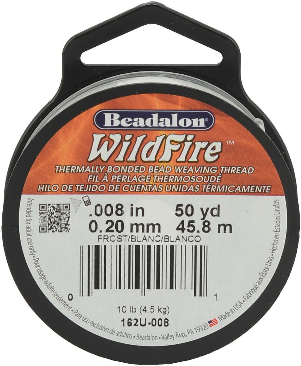 BEADALON-Wildfire Bead Weaving Thread. Ideal for stringing Toho and other seed beads, this thread features the strength and durability of DandyLine with a smooth thermally bonded coating to create a superior stringing product that can not be pierced with a needle. Super-strong, waterproof, and zero-stretch, and abrasion resistant this cord will not fray at the ends which makes it easy to thread through a needle. Size: 0.008in/0.2mm (12 pound breaking point), 50 yards. Made in USA.
