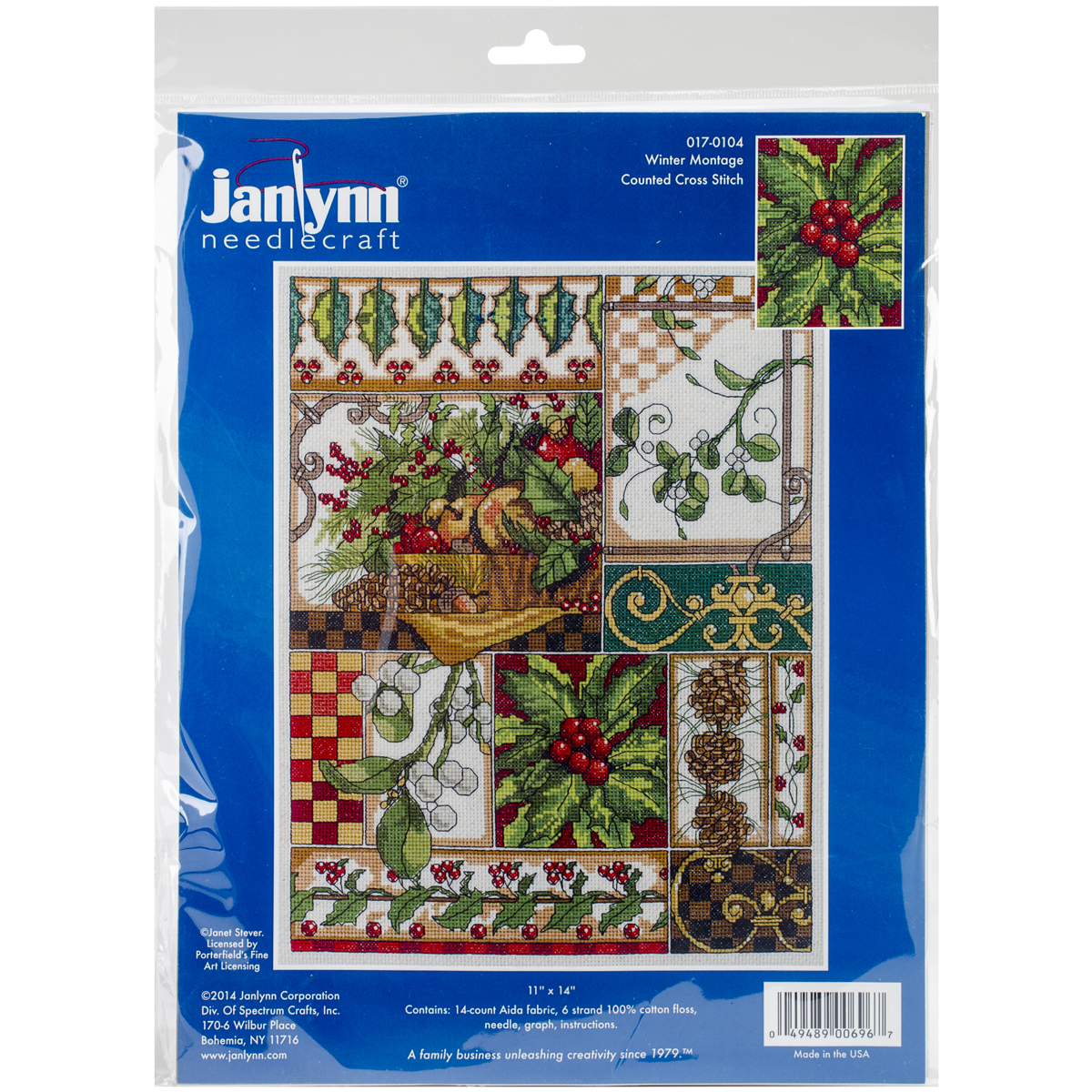 Janlynn-Counted Cross Stitch Kit. Creative designs and quality products are put in to each of Janlynn's kits. This package contains 14-count white Aida, cotton floss, one needle, graph and instructions. Design: Winter Montage. Finished dimensions: 14x11 inches (mat and frame are not included). Made in USA.