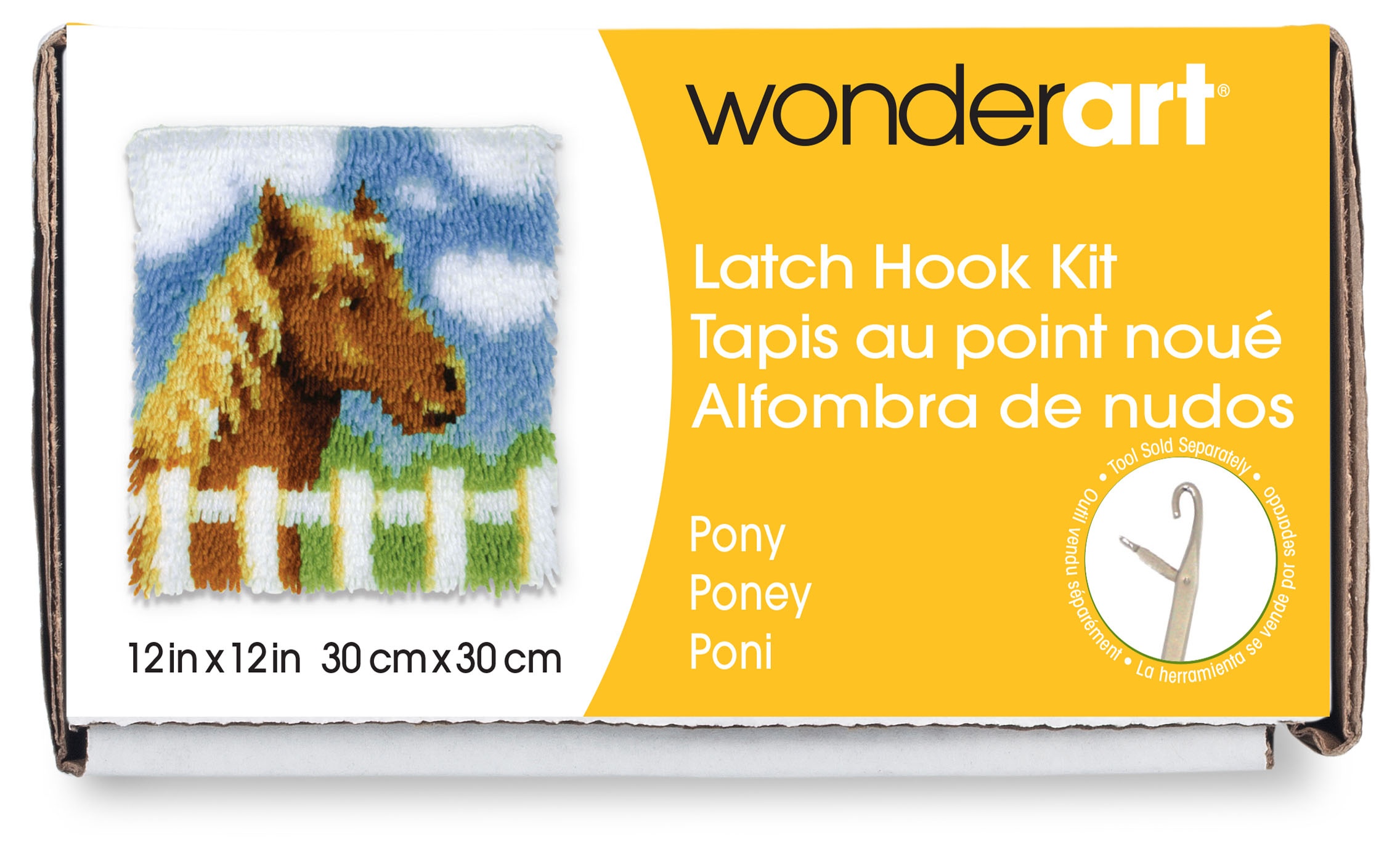 CARON-Wonderart Latch Hook Kit: Pony. These small kits are ideal for beginners or quick weekend projects. When finished, they can be made into table top decorations or to decorate a wall! This package includes one 12x12 inch pony canvas (50% polyester/50% cotton), pre-cut rug yarn (100% acrylic), illustrated instructions on how to latch a hook and one easy-to-follow chart. Latch hook tool and binding not included. Hand wash or dry clean. Made in USA.