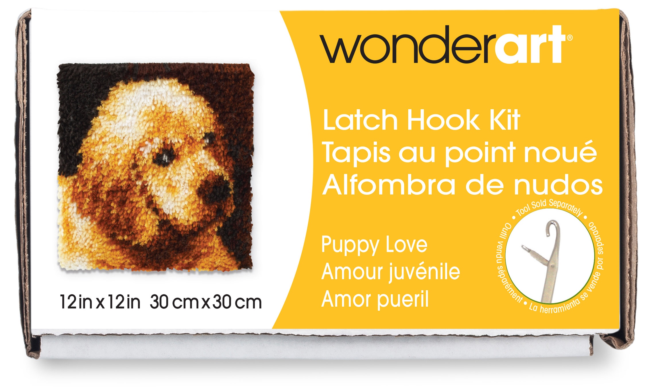 CARON-Wonderart: Latch Hook Kit. This kit will give you a rug that is wonderfully lush and can be made to fit any decor motif. The possibilities are astounding, you can use them on the floor, wall, sofa, bed, window or even make them into pillows, nap-mats and seat cushions. They are easy to make, it would be a wonderful family project! This kit contains a 50% polyester/50% cotton canvas, pre- cut rug yarn, illustrated how to latch hook instructions and an easy-to-follow chart. Hook tool and binding materials are not included. Size: 12x12 inches. Design: Puppy Love. Made in USA.