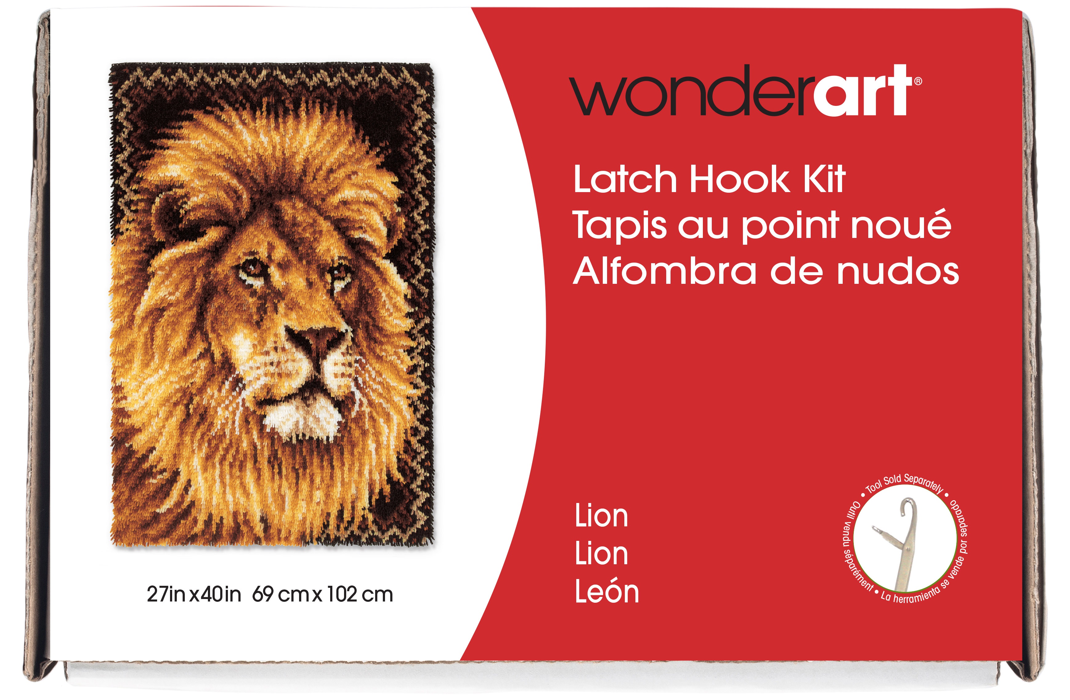CARON-Wonderart: Latch Hook Kit. This kit will give you a rug that is wonderfully lush and can be made to fit any decor motif. The possibilities are astounding, you can use them on the floor, wall, sofa, bed, window or even make them into pillows, nap-mats and seat cushions. They are easy to make, it would be a wonderful family project! This kit contains a 50% polyester/50% cotton canvas, pre- cut rug yarn, illustrated how to latch hook instructions and an easy-to-follow chart. Hook tool and binding materials are not included. Size: 27x40in. Design: Lion. Made in USA.