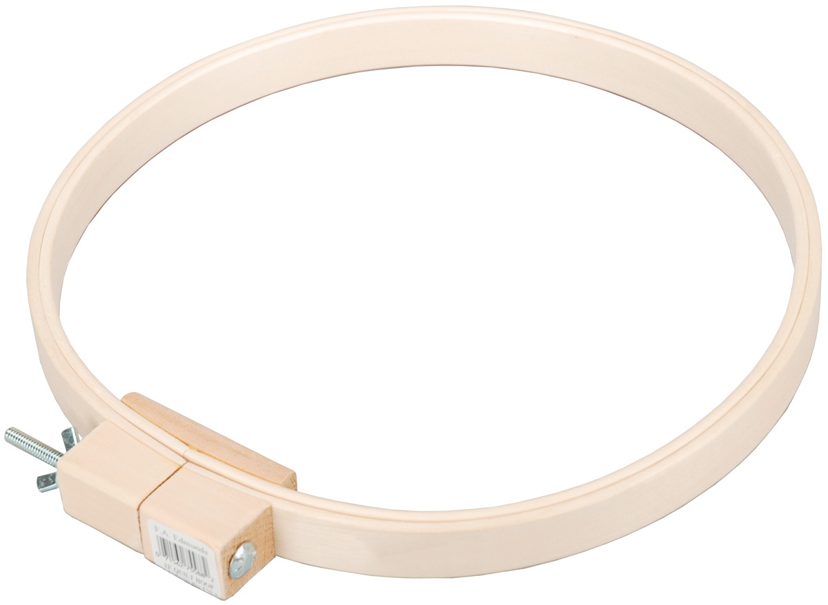 FRANK A EDMUNDS-This 12 solid hardwood hoop with wood fastener holds your work tight and wrinkle free. A natural color with polished edges to prevent snagging of needlework.