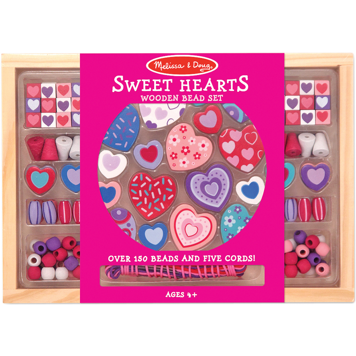 MELISSA & DOUG-Wood Bead Set: Sweet Hearts. Kids can create beautiful jewelry with their own bead set! Colorful strings and bright beads can be used in any combination for one-of-a-kind necklaces, bracelets, and anklets. All the beads are wooden and painted with bright colors in fun patterns and designs. The entire set comes in a beautiful 6-7/8x9-3/4x1 inch wood box that can be repurposed in a variety of crafty ways once all the beads have been used. This set contains over 150 wood beads and five cords. WARNING- CHOKING HAZARD-Small parts and small balls. Not for children under 3 years. Recommended for ages 4 and up. Imported.