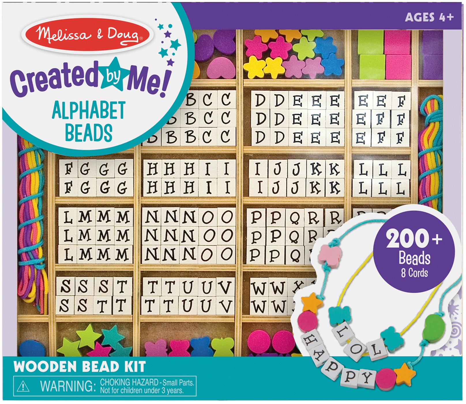 MELISSA & DOUG-Wooden Stringing Beads Kit. Kids can create fun pieces of jewelry, lanyards, key chains, and other such decorative items all while developing fine motor skills with this fun beading kit. It includes an assortment of alphabet and shape beads that can be used in any combination for one-of-a-kind designs. All of the beads are wood and the shaped pieces have been painted with fun colors. A list of suggested activities is included to help children learn the alphabet, counting, colors, and shapes. The entire set comes in a 9-1/2x11x1/2 inch wood box which can be repurposed in a variety of crafty ways once the beads have been used. This package contains over 200 beads and eight laces. WARNING-CHOKING HAZARD- Small parts. Not for children under 3 years. Recommended for ages 4 and up. Imported.