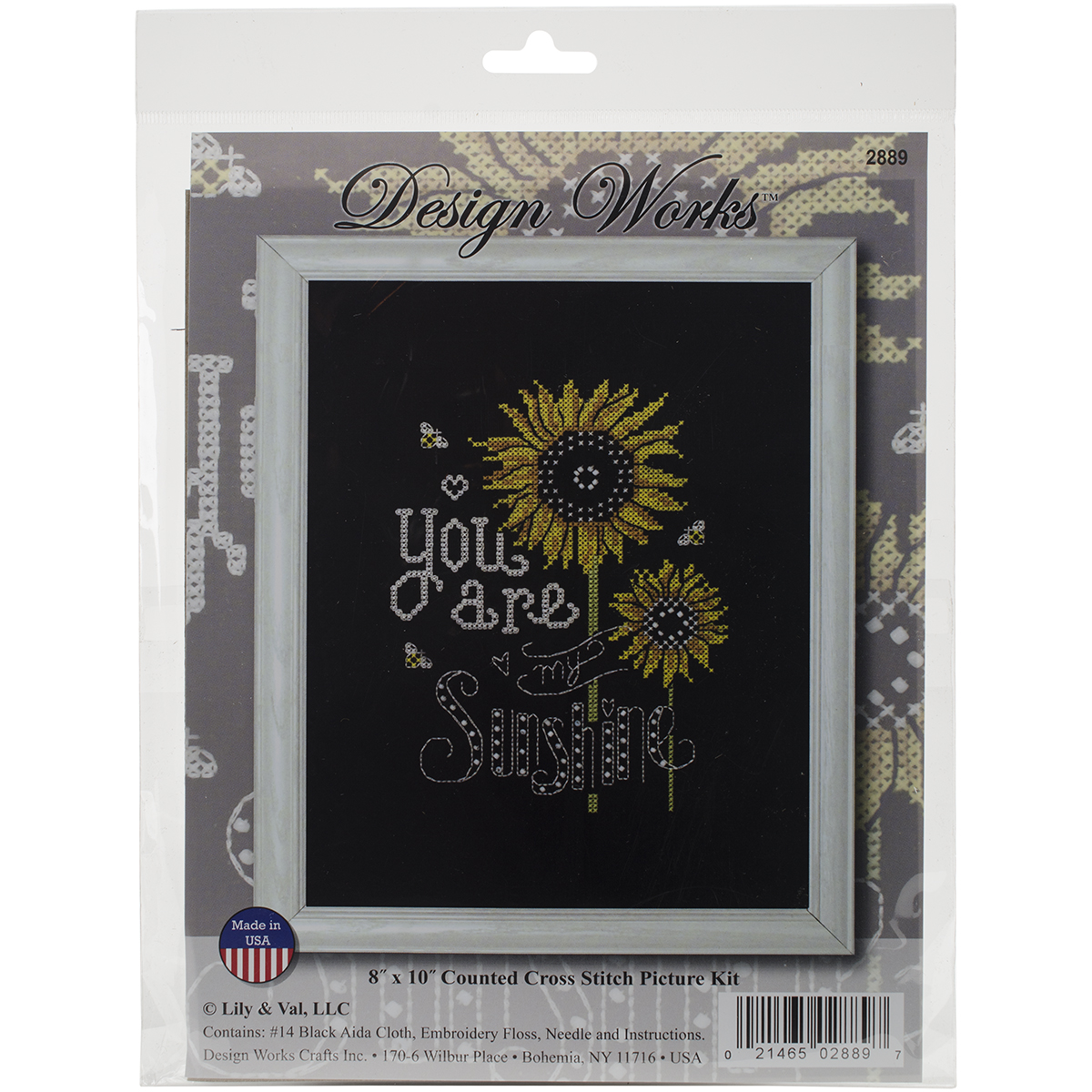 Tobin-Design Works: Counted Cross Stitch Kit. Beautiful designs and top quality materials make Tobin one of the top cross stitch kit makers worldwide. This package contains 14-count black Aida cloth, embroidery floss, one needle and instructions. Design: You Are My Sunshine. Finished size: 10x8 inches. Made in USA.