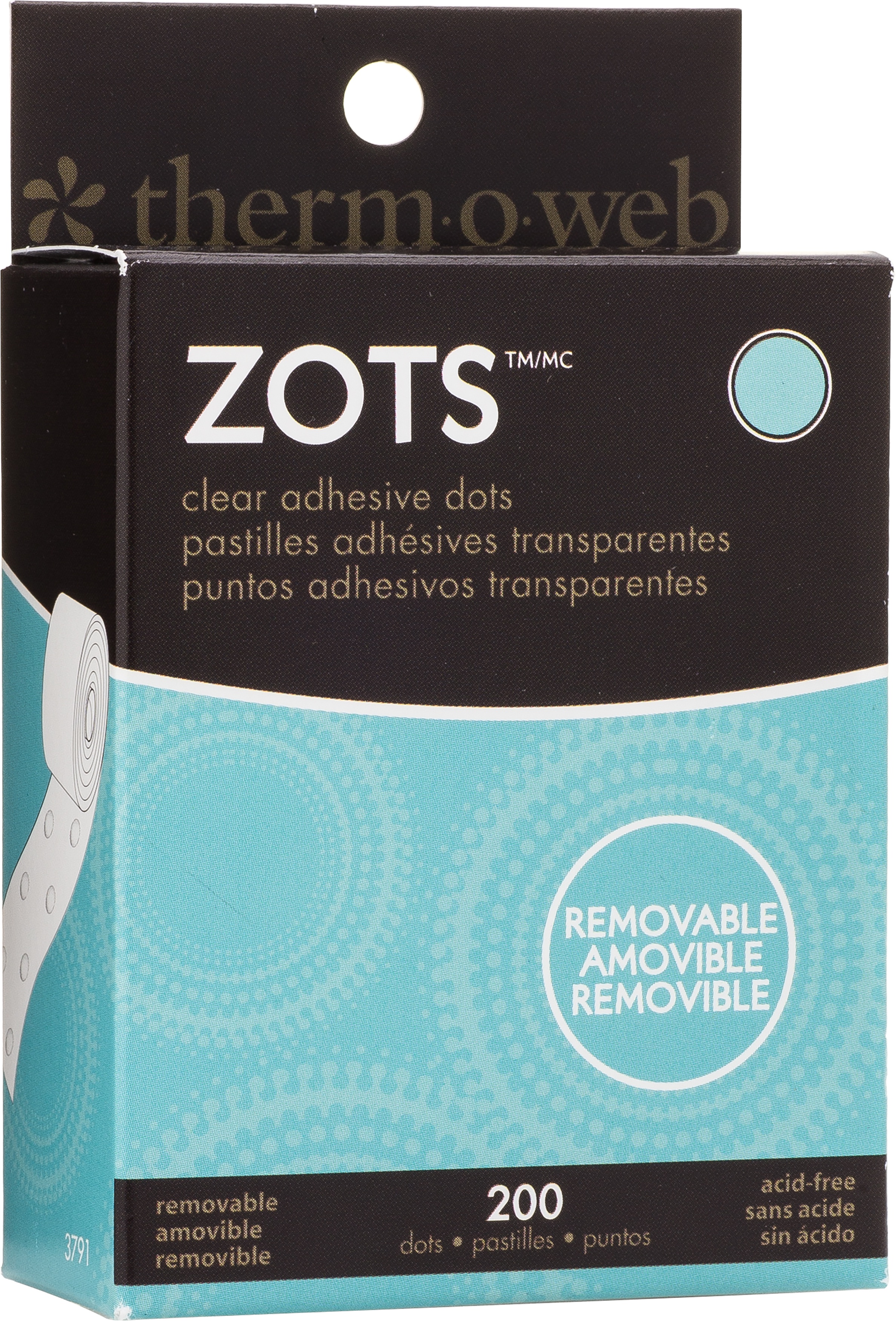 THERM O WEB-Zots Removable Clear Adhesive Dots. These acid free glue dots are perfect for scrapbooking, photos, paper crafts, embellishments and die-cuts made of paper, plastic, metal and more! This package contains 200 3/8in glue dots. Made in USA.